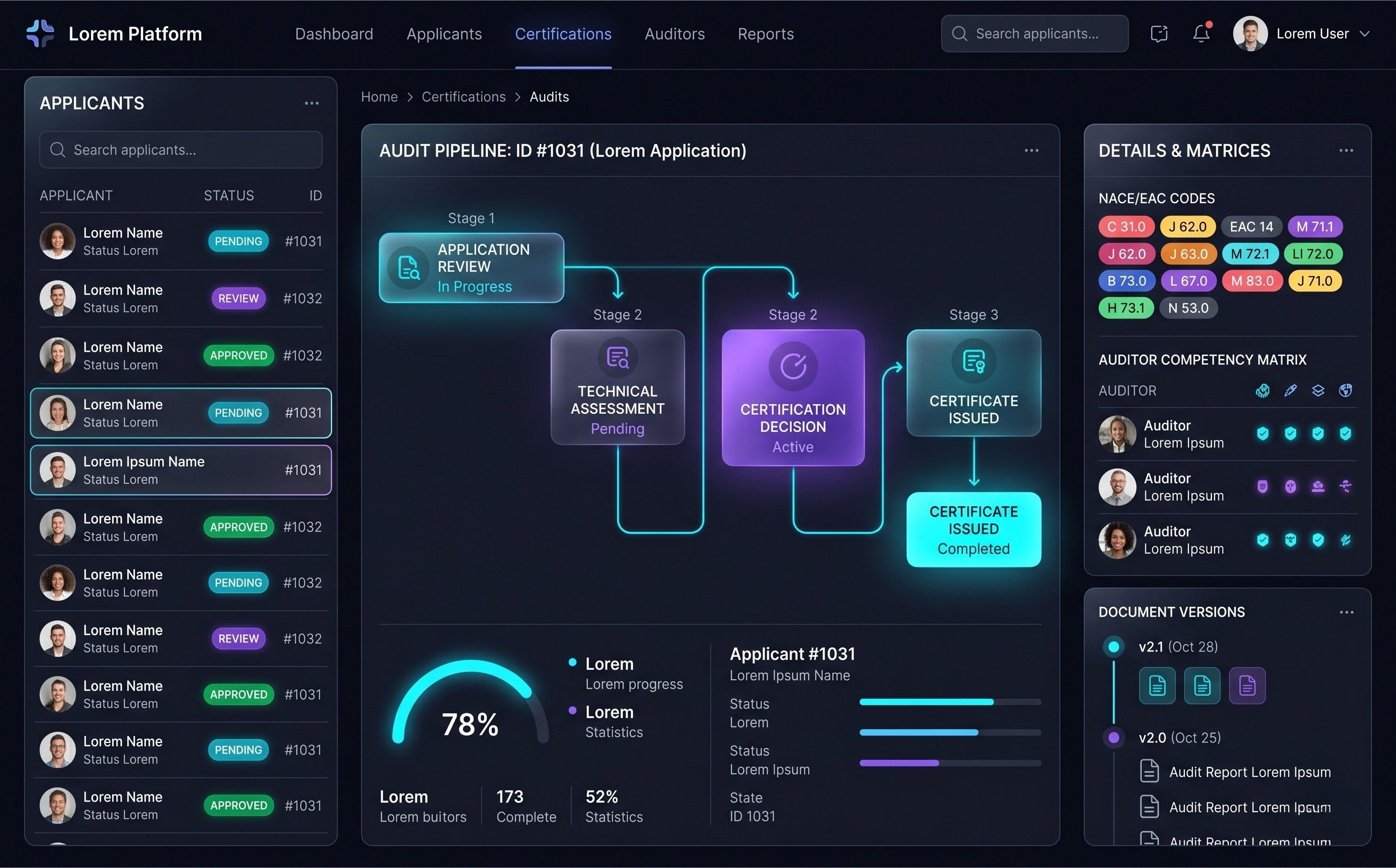 Başvurudan sertifika çıkışına kadar tüm denetim sürecini tek panelde yönetebilen sistem. NACE/EAC kod yetkilendirme, Stage 1/2 denetim, gözetim takibi.
